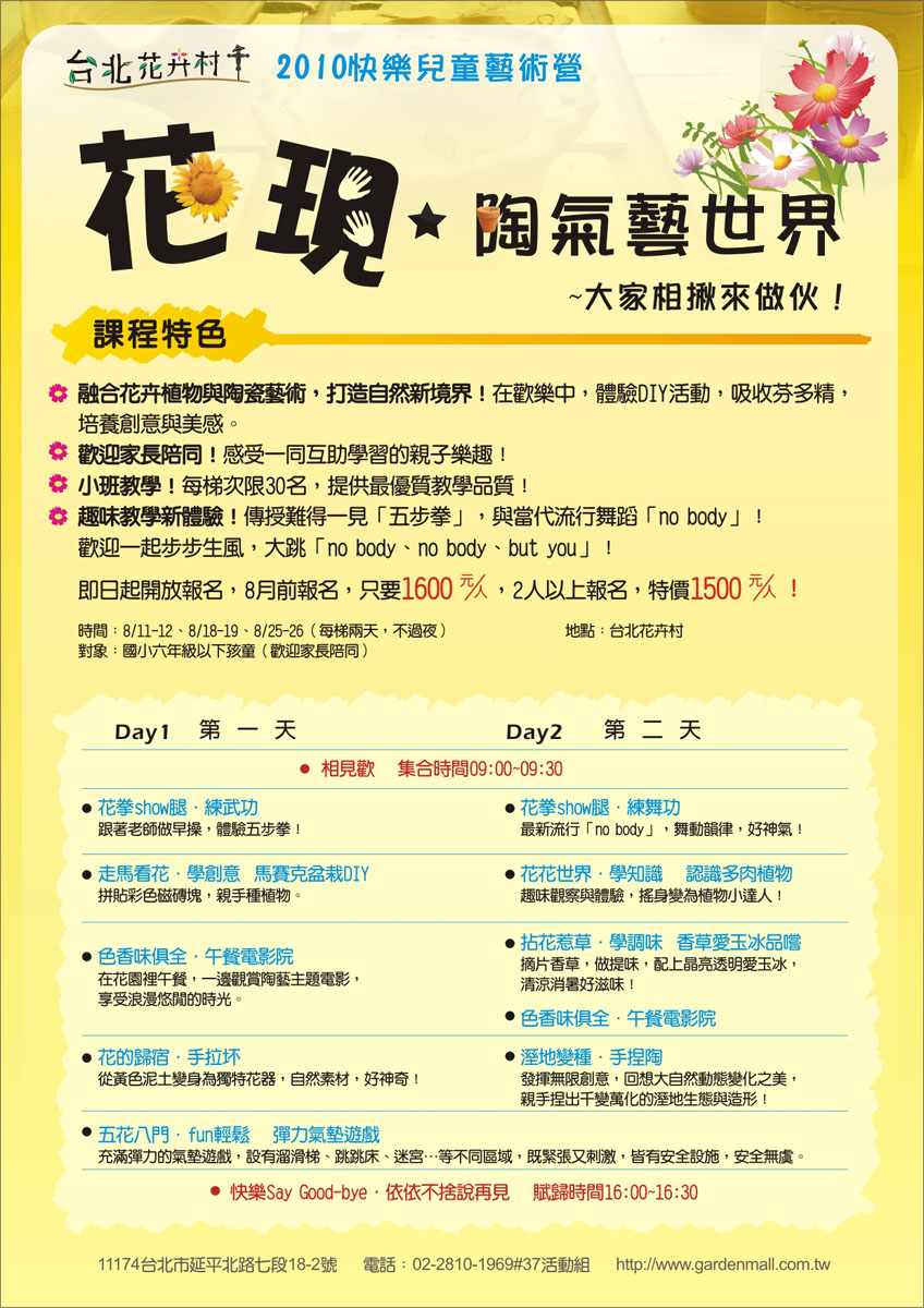 2010快樂兒童藝術營,融合花卉植物與陶瓷藝術,讓孩子在歡樂中,體驗多項DIY活動,培養美感與創意,讓孩子在城市花園禮,吸收自然芬多精,進入陶藝的世界,享受創作的樂趣!