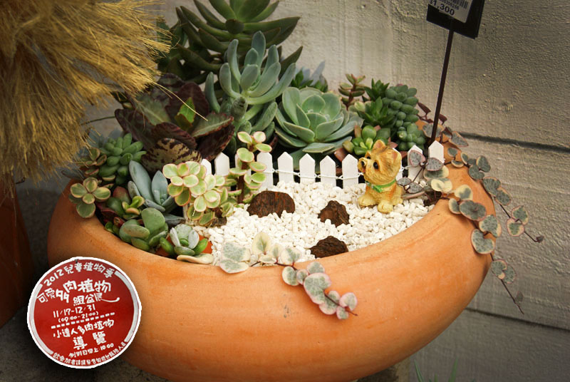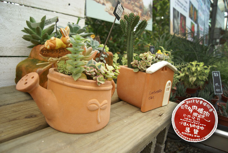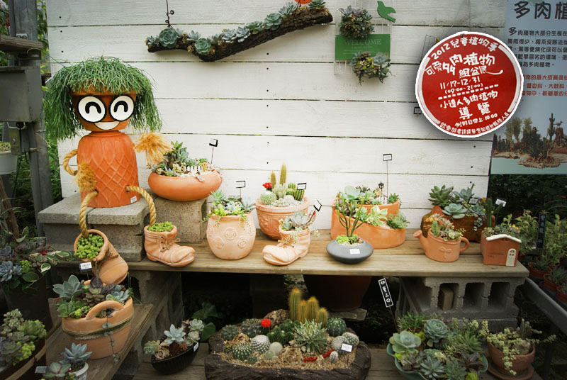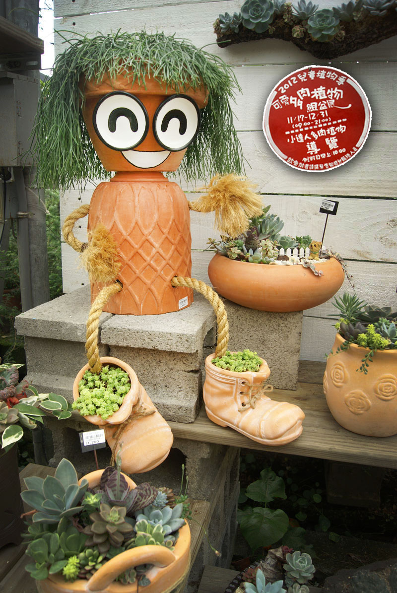 利用陶盆組合成有造型的娃娃,頭髮是真的植物,鞋子裡也種植可愛的多肉植物。 |