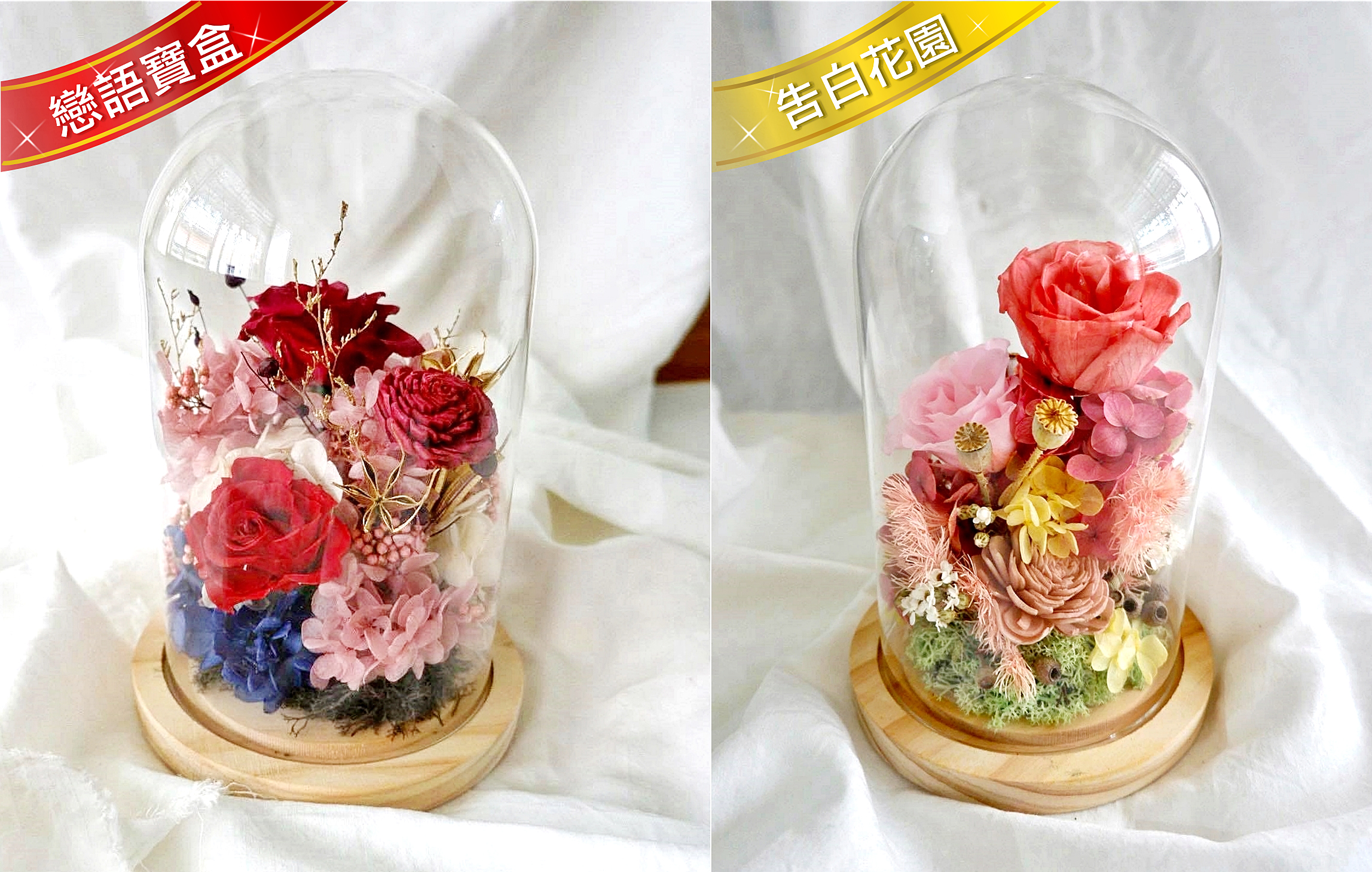 永生玫瑰花花語:永不落寞的愛情;八月份綠手作課程,特別推出鐘罩花禮手作課,以永生乾燥玫瑰花,搭配7種以上乾燥花材,讓您以「告白花園」或是「戀語寶盒」為主題,創造出象徵永恆之愛的鐘罩花禮,獻給最愛的她(他)!