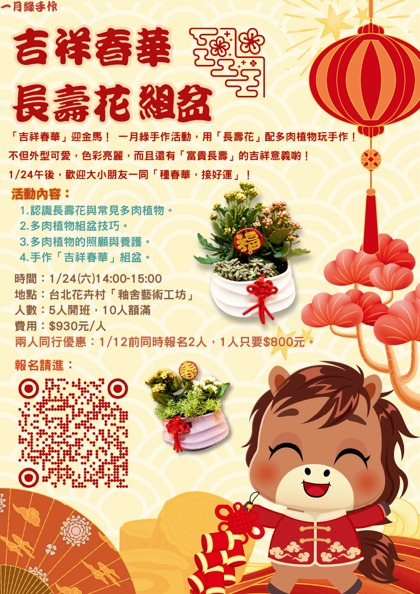 「吉祥春華」迎金馬! 一月綠手作活動,用「長壽花」配多肉植物玩手作! 不但外型可愛,色彩亮麗,而且還有「富貴長壽」的吉祥意義喲! 1/24午後,歡迎大小朋友一同「種春華,接好運」! 報名連結:https://forms.gle/JjHgkqm3RSWZcQCs9 上一個 回列表 下一個